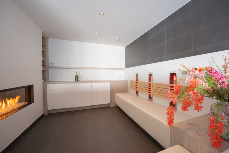 Onze privé wellness beschikt over een ruime belevenisdouche, infraroodhoek, hamman, Finse sauna en jacuzzi. Dit in een gezellig kader met een open haard en knusse zithoek.