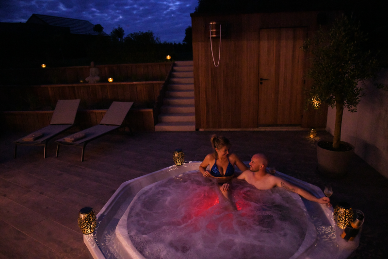 De buitenspa is altijd beschikbaar, ook bij regenweer of sneeuw. De temperatuur wordt aangepast naargelang de weersomstandigheden zodat deze altijd perfect voelt, in de winter is de spa cosy en verwarmend (38°), bij warme dagen heerlijk verkoelend (35-37°).