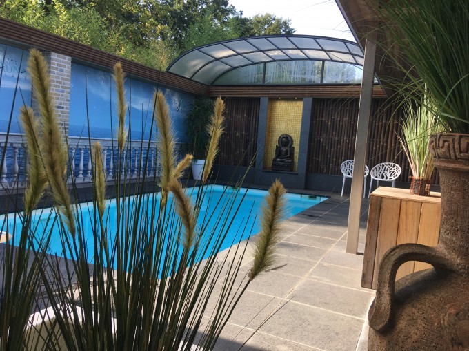 Super-gezellige privé-sauna met gegarandeerde hygiene. Hemels sauna-plezier ervaren in een sfeervolle omgeving met: overdekt of openlucht zwembad 30° (dak kan volgens wens klant helemaal open of dicht), jacuzzi 38°, panoramische Finse sauna met zicht op zwembad, Infra-rood cabine, dubbele douche met ingebouwde zonnebank, relaxruimte met zelfbedieningsbar en een uitgebreide lijst voor allerlei hapjes.