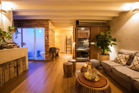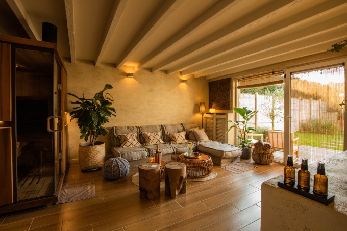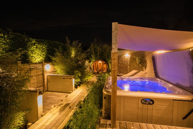 Je vindt er een infrarood sauna, een barrel sauna in de tuin, Turkse stoomcabine, een warme gezellige loungeruimte en een buitendouche rechtover de grote hot Jacuzzi.